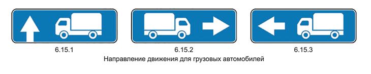 Знаки 6.15.1–6.15.3 «Направление движения для грузовых автомобилей». Рекомендуемое направление движения для грузовых автомобилей, тракторов и самоходных машин, если на перекрёстке их движение в одном из направлений запрещено.