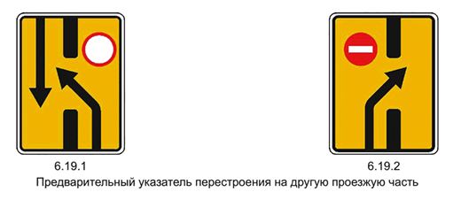 5.7.21 Знаки 6.19.1 и 6.19.2 «Предварительный указатель перестроения на другую проезжую часть» применяют на дорогах с разделительной полосой для указания направления движения для объезда временно закрытого участка проезжей части и направления движения для возвращения на проезжую часть, предназначенную для движения в данном направлении.