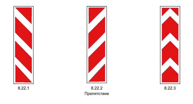 Таблички 8.22.1–8.22.3 «Препятствие». Обозначают препятствие и направление его объезда. Применяются со знаками 4.2.1–4.2.3.